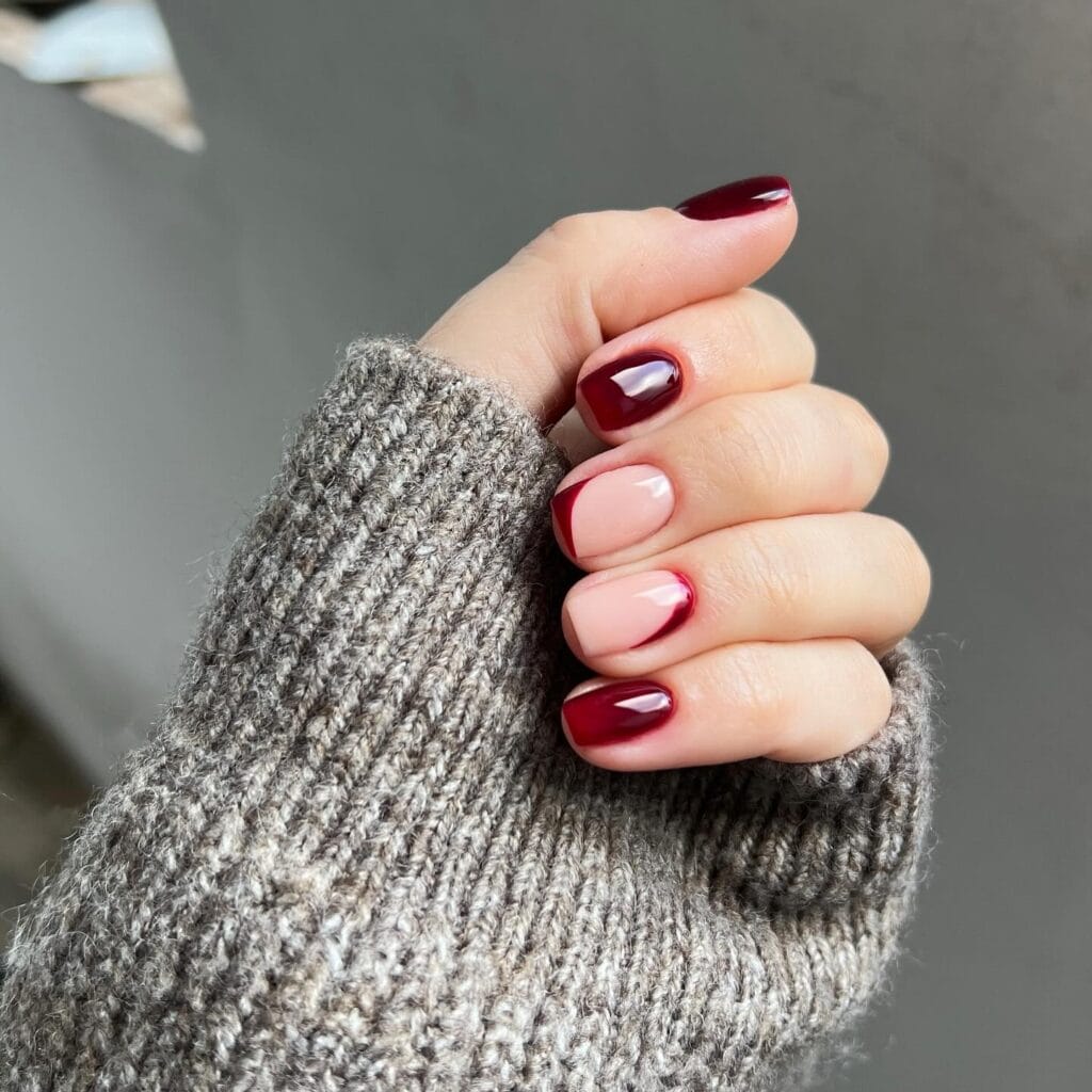 If you’re bored of plain manis, swap one nail for a nude base with a burgundy French swoop. It keeps the vibe elevated while showing you actually think about nail aesthetics.