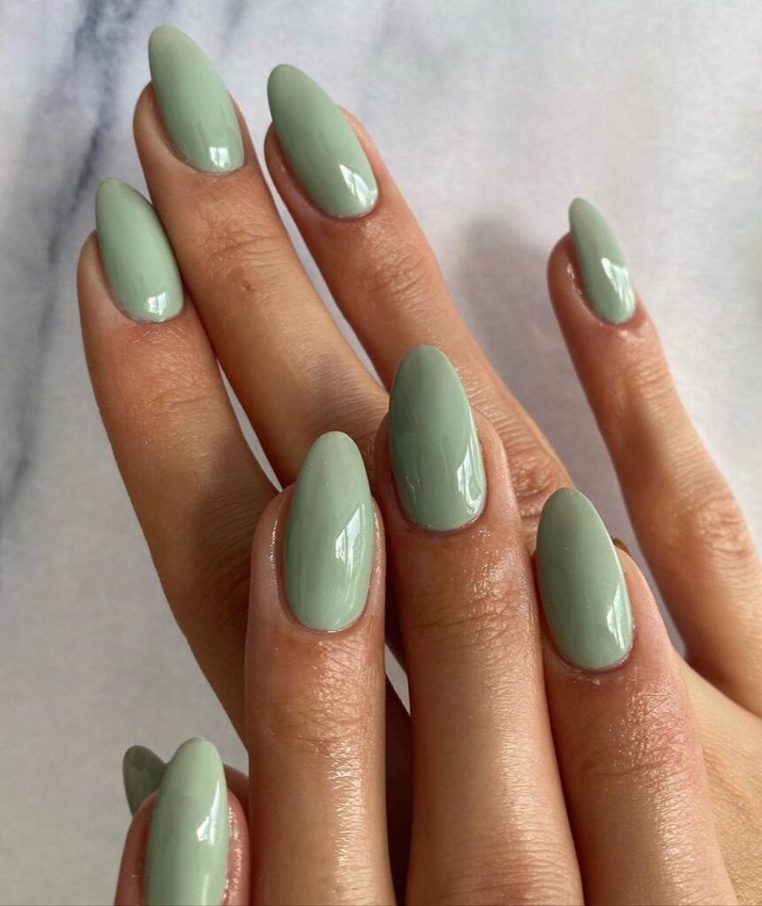It’s the green you pick when you want something seasonal but not heavy. Pairs well with linen, gold jewelry, cream knits. The kind of color that looks effortless even when you add a swirl detail or a glitter accent nail.